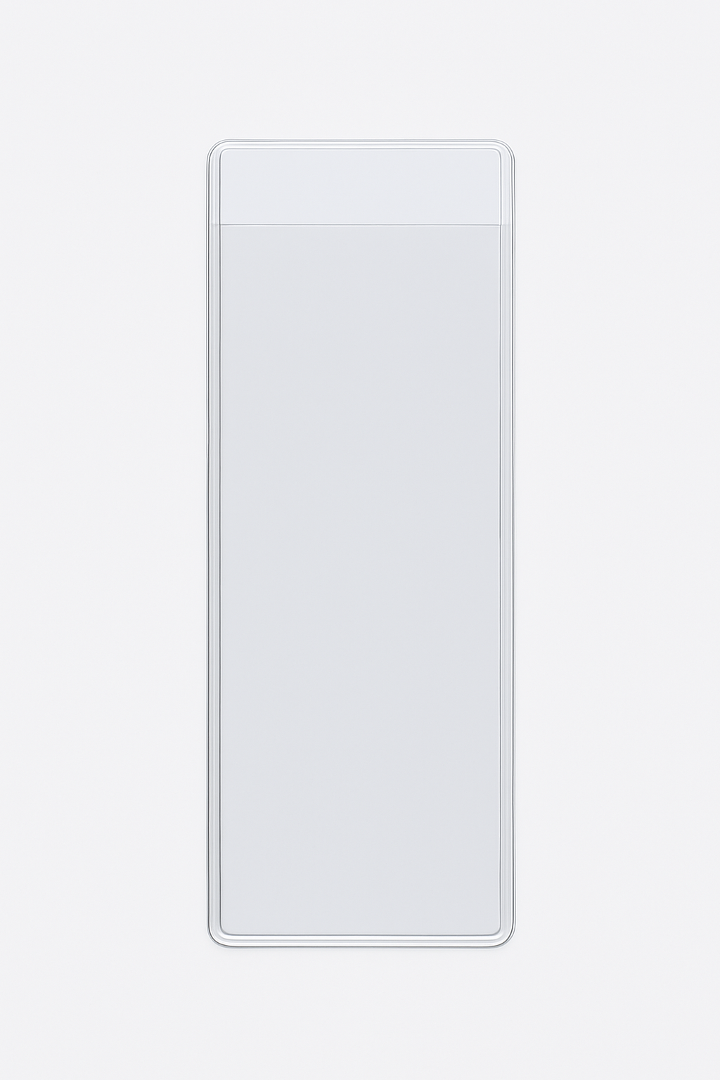 Vinyl Sleeve with Adhesive Back - with 1/4" Drop - External Dimensions 1.25" x 3.875" - Open on Short Side (Portrait) - with Beaded Edge and Round Corners - Made with 6 Mil Clear Vinyl Material and 4 Mil Adhesive Back Material